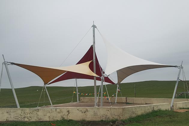 哈尔滨膜结构景观采用PTFE膜材,是在超细玻璃纤维织物上涂以聚四氟乙烯树脂而成的材料。这种膜材有较好抗紫外线、抗老化性能和阻燃性能。现在许多的景观膜结构厂家采用PTFE膜材来构筑景观膜结构。